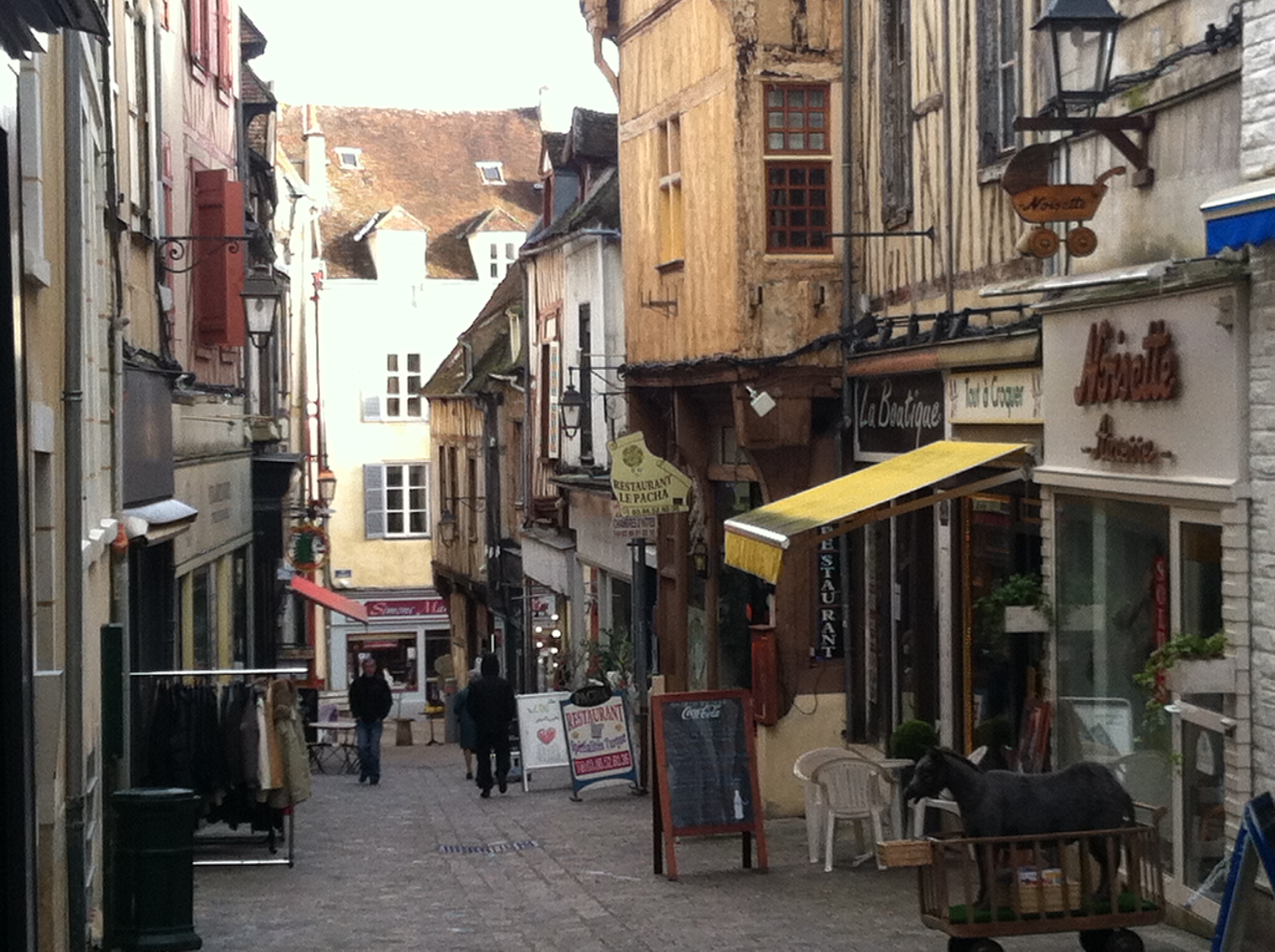 A gloden clock. A tower. A small village. Cobbled stoned streets and pathways snake through the ancient buildings, leading to the town square or the cathedral. They all lead to wonderful experiences. We stopped in Auxerre to enjoy a leisurely stroll in the old city as well as to find a place to have lunch. Asking around town, the decision was to go to “Salt and Pepper” which everyone recommended. The bar was upstairs as you walked in and the eating area was down a winding staircase. Not in the basement, but at street level at the back of the restaurant! We had just been seated before the place was invaded by the locals and soon was filled to capacity.