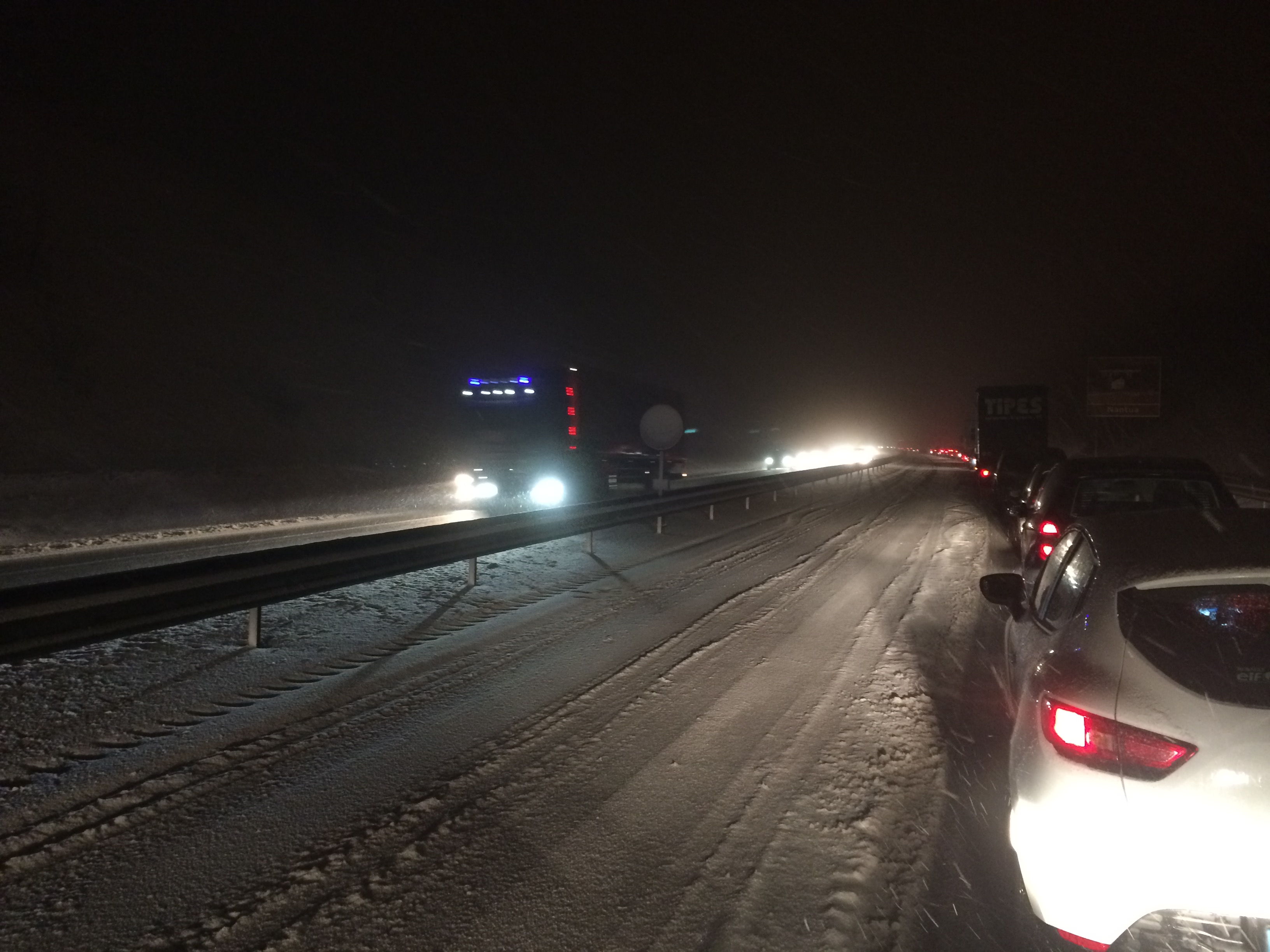 Traffic started to move slowly. We had now been sitting watching through the windshield the snow fall for over three hours. Since hundreds of cars had been parked fairly closely all in the same lane there were very little snow and moving ahead was not a problem.
